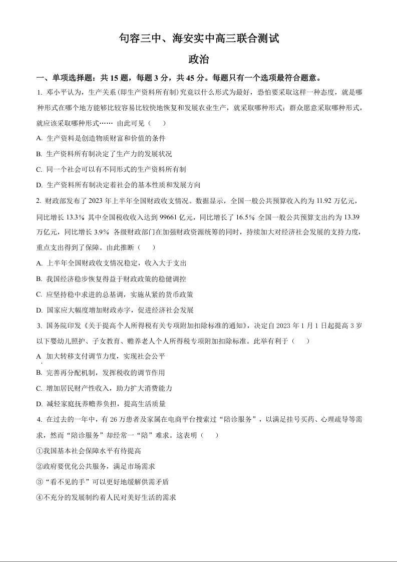 江苏省句容市第三中学、海安实验中学2023-2024学年高三上学期10月联考 政治