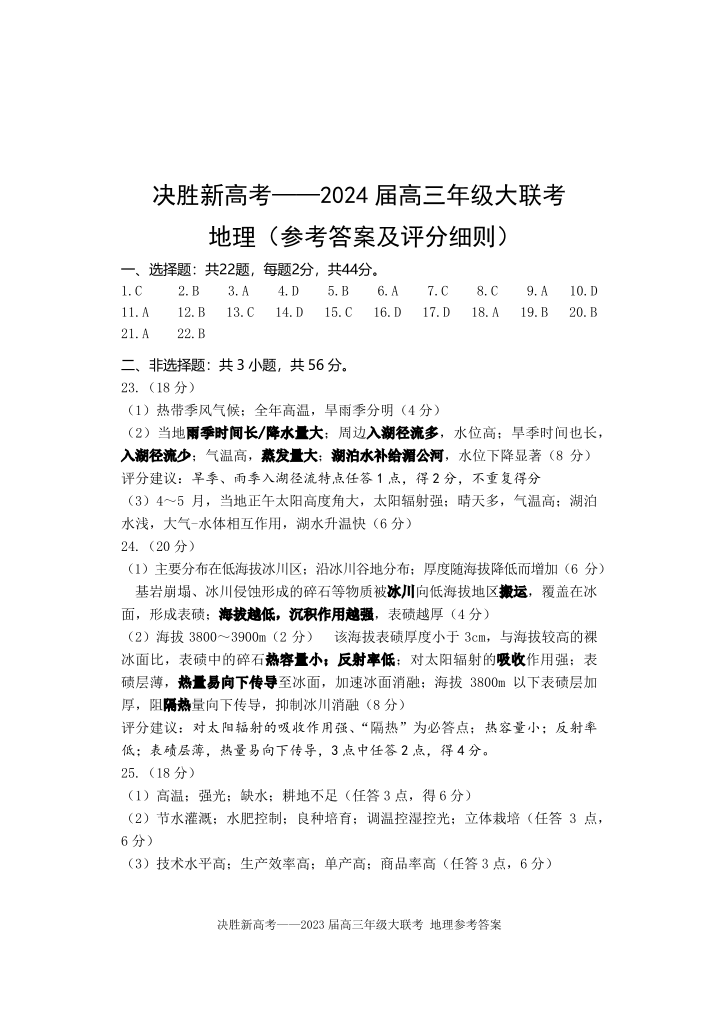 江苏省决胜新高考2023-2024学年高三上学期10月大联考 地理答案