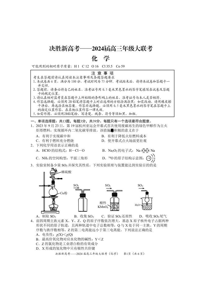 江苏省决胜新高考2023-2024学年高三上学期10月大联考 化学