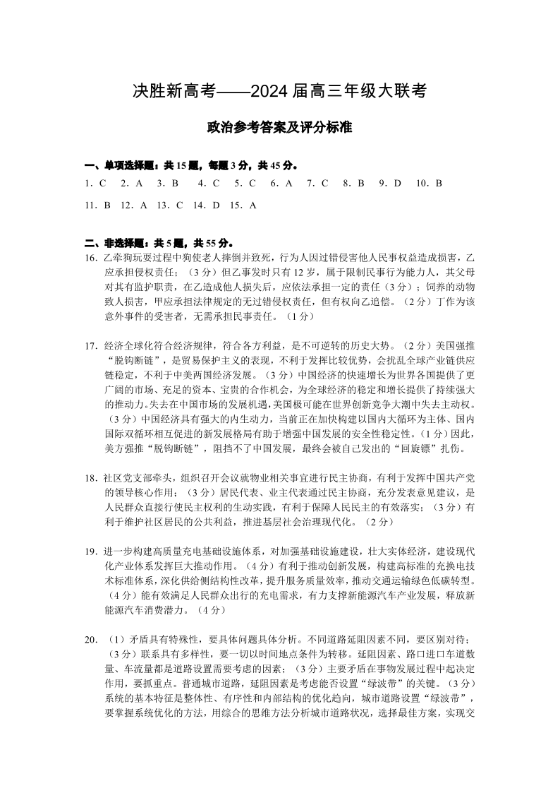 江苏省决胜新高考2023-2024学年高三上学期10月大联考 政治答案