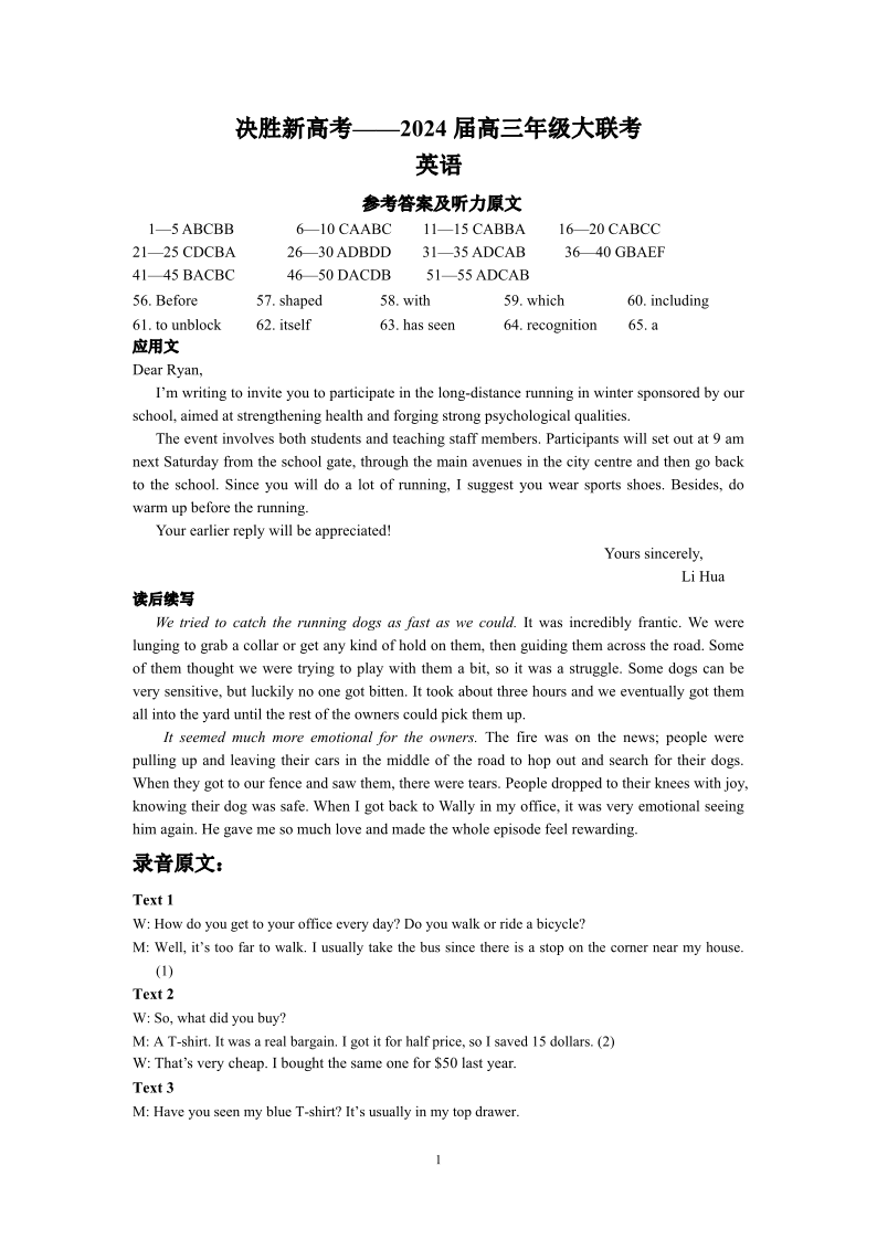 江苏省决胜新高考2023-2024学年高三上学期12月大联考 英语答案