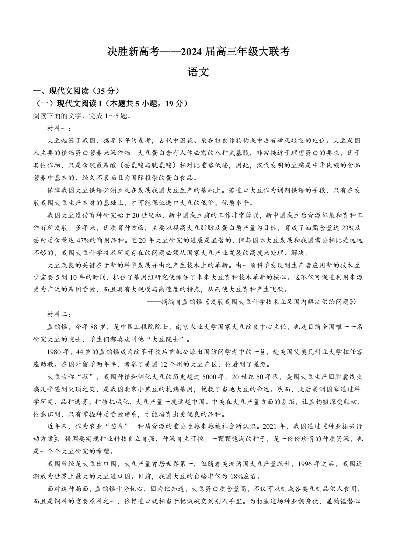 江苏省决胜新高考2023-2024学年高三下学期2月大联考 语文