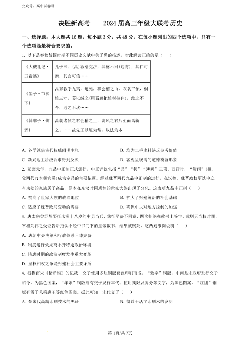江苏省决胜新高考2023-2024学年高三下学期2月大联考 历史
