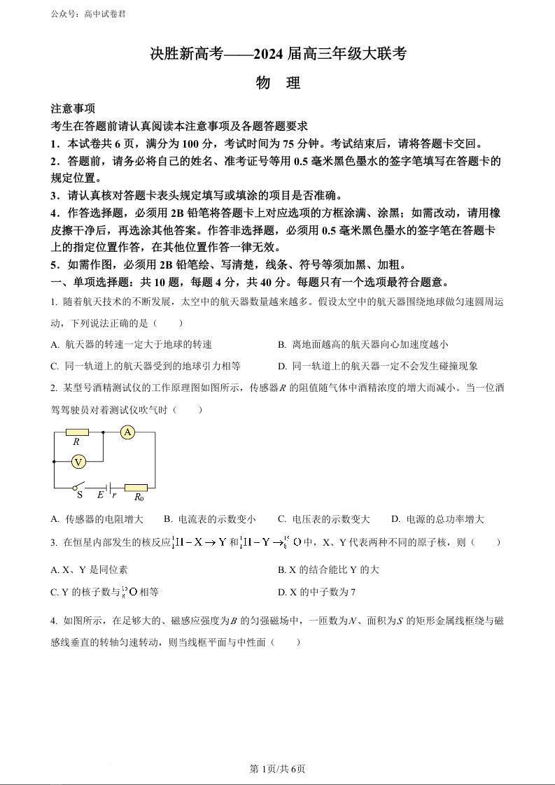 江苏省决胜新高考2023-2024学年高三下学期2月大联考 物理