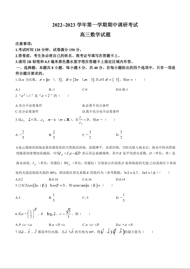 江苏省连云港市2023-2024学年高三上学期期中考试 数学
