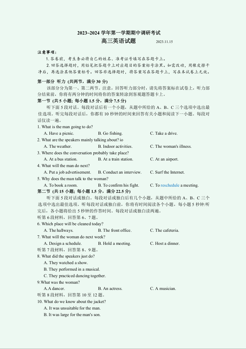 江苏省连云港市2023-2024学年高三上学期期中考试 英语