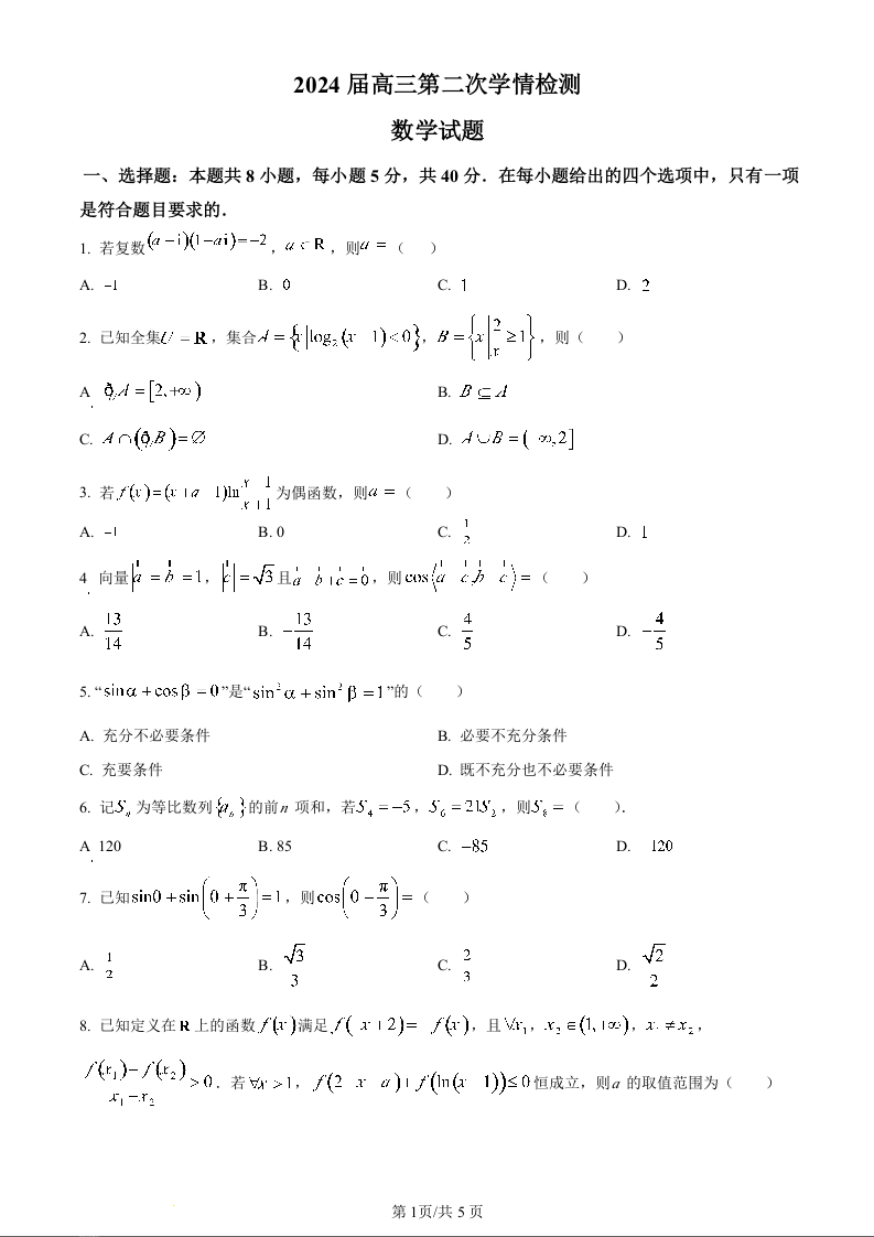 江苏省连云港市部分学校2023-2024学年高三上学期10月联考 数学