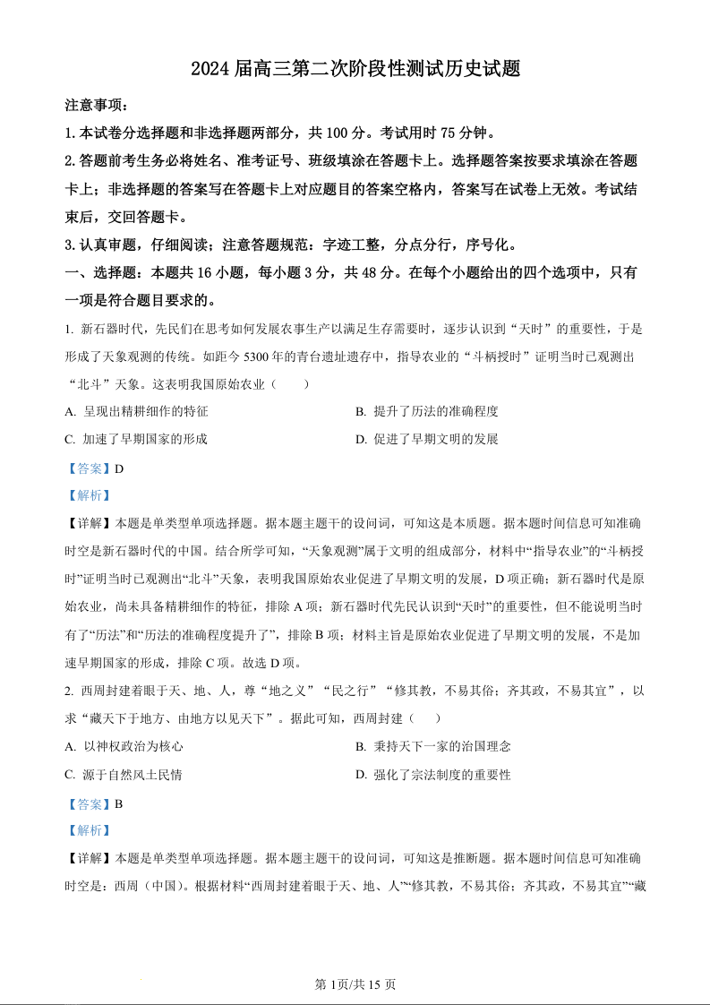江苏省连云港市部分学校2023-2024学年高三上学期10月联考 历史答案