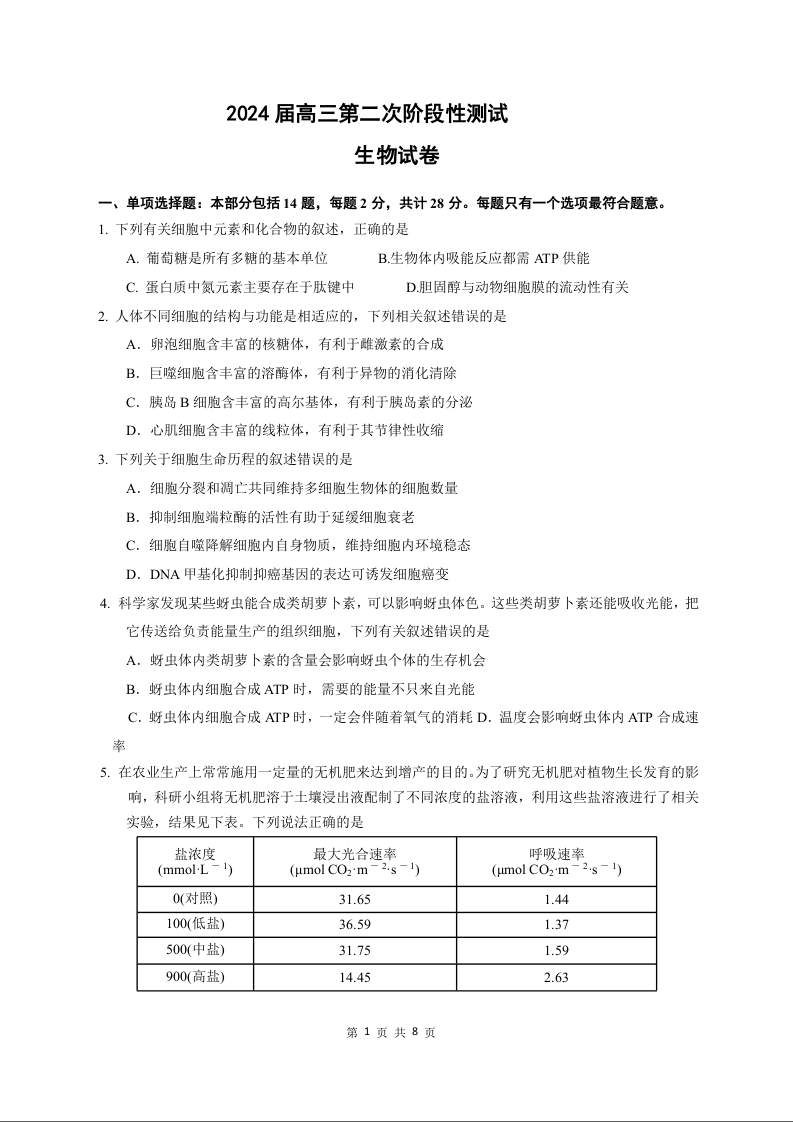江苏省连云港市部分学校2023-2024学年高三上学期10月联考 生物