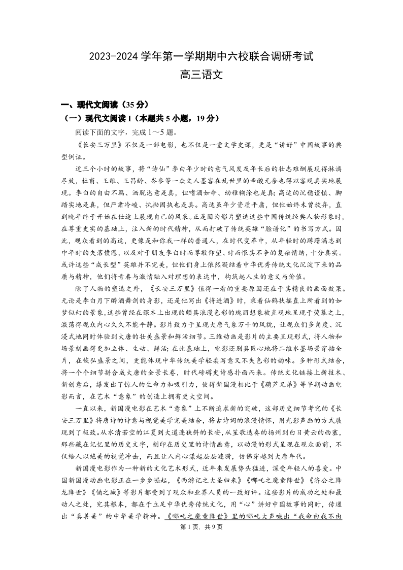 江苏省南京市六校2023-2024学年高三上学期期中联合调研 语文