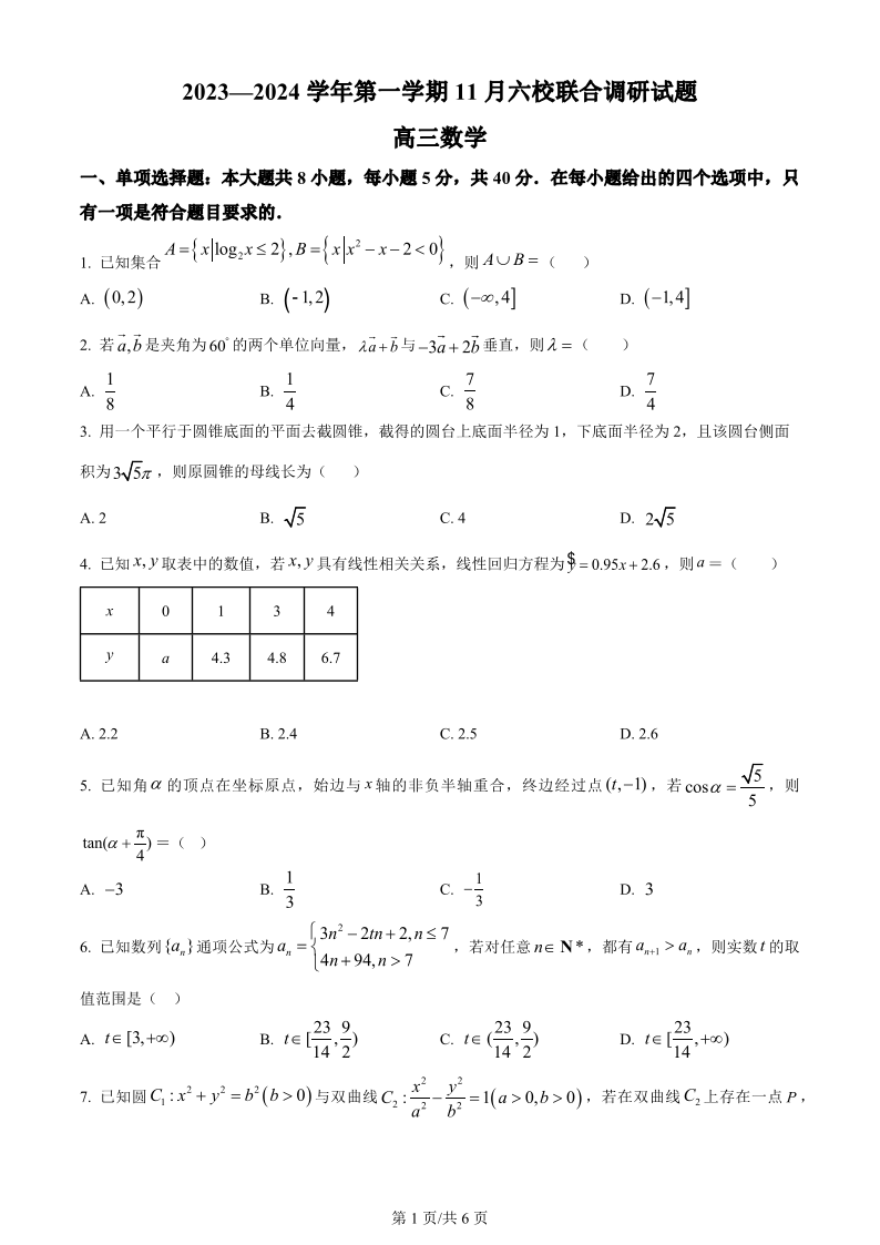 江苏省南京市六校2023-2024学年高三上学期期中联合调研 数学