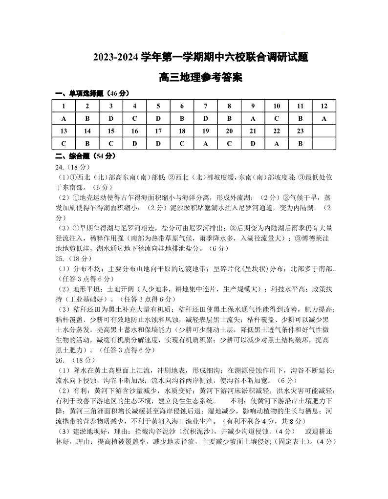 江苏省南京市六校2023-2024学年高三上学期期中联合调研 地理答案