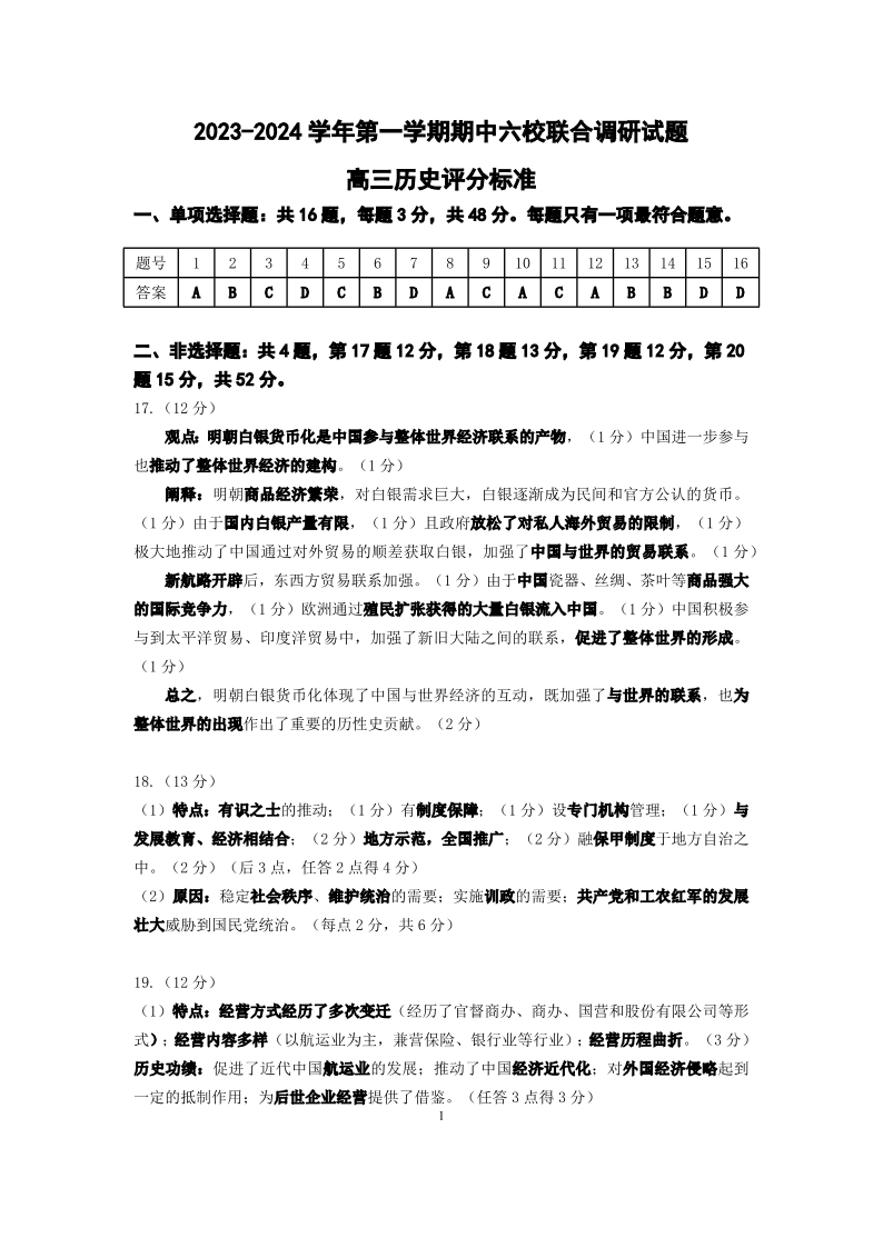 江苏省南京市六校2023-2024学年高三上学期期中联合调研 历史答案