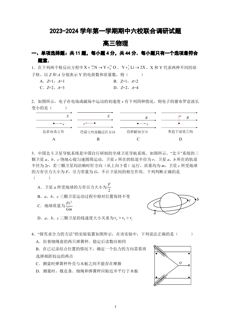 江苏省南京市六校2023-2024学年高三上学期期中联合调研 物理