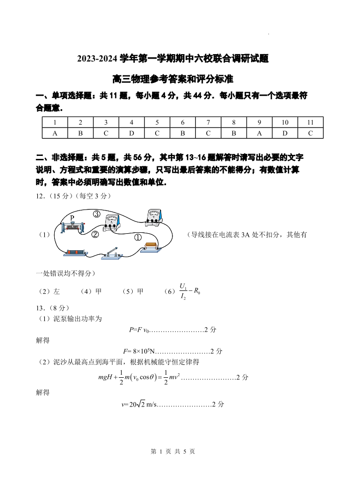 江苏省南京市六校2023-2024学年高三上学期期中联合调研 物理答案