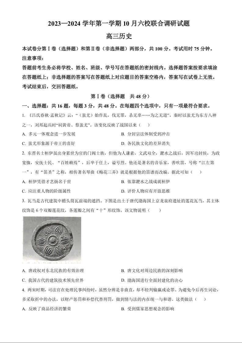 江苏省南京市六校联合体2023-2024学年高三上学期10月联合调研 历史