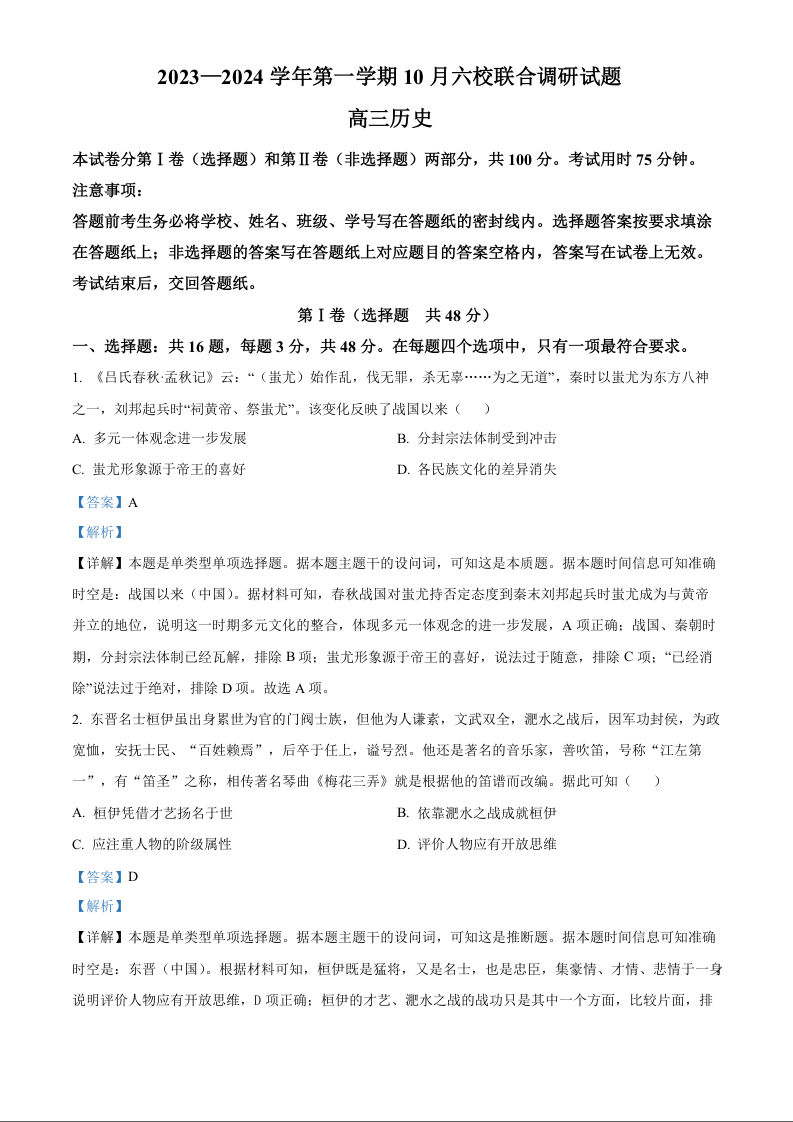 江苏省南京市六校联合体2023-2024学年高三上学期10月联合调研 历史答案
