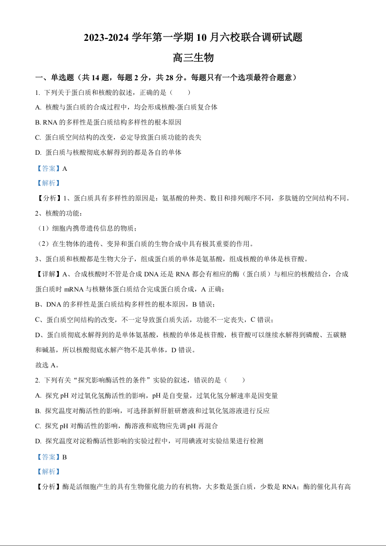 江苏省南京市六校联合体2023-2024学年高三上学期10月联合调研 生物答案