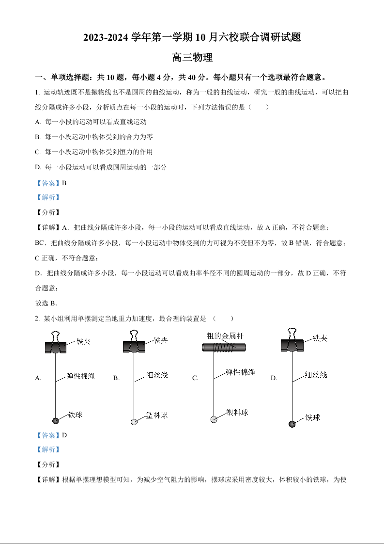 江苏省南京市六校联合体2023-2024学年高三上学期10月联合调研 物理答案