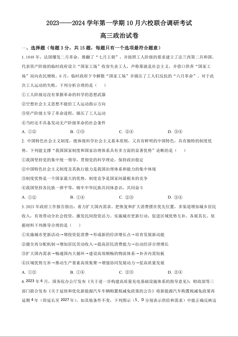 江苏省南京市六校联合体2023-2024学年高三上学期10月联合调研 政治