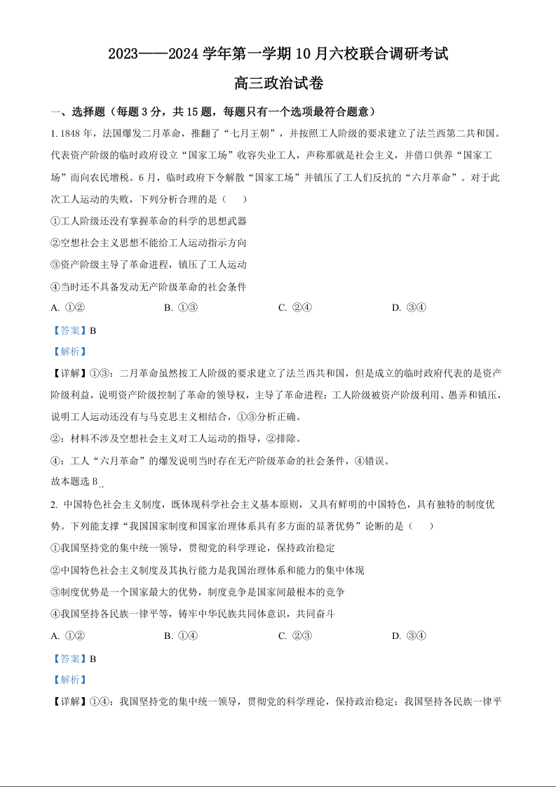 江苏省南京市六校联合体2023-2024学年高三上学期10月联合调研 政治答案