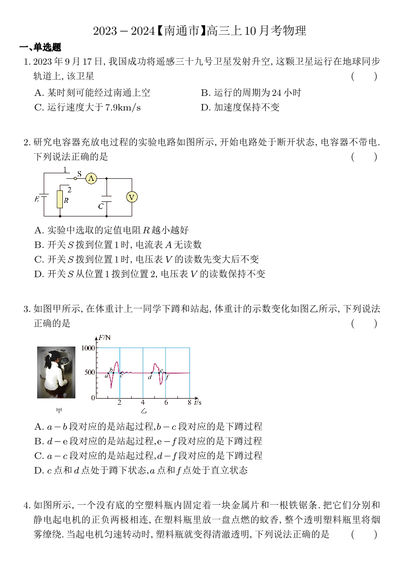江苏省南通市2024届高三上学期10月份质量监测 物理