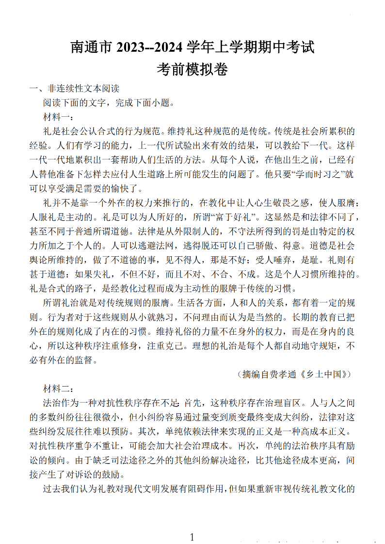江苏省南通市2024届高三上学期期中考试考前模拟卷 语文
