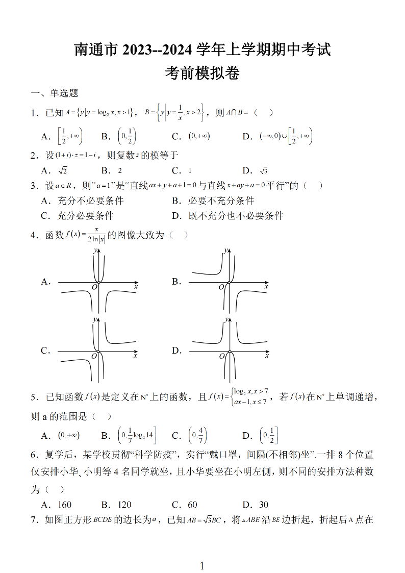 江苏省南通市2024届高三上学期期中考试考前模拟卷 数学