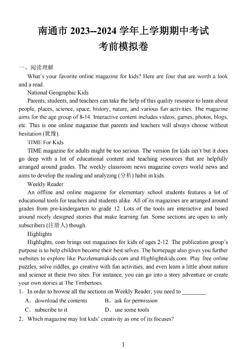 江苏省南通市2024届高三上学期期中考试考前模拟卷 英语