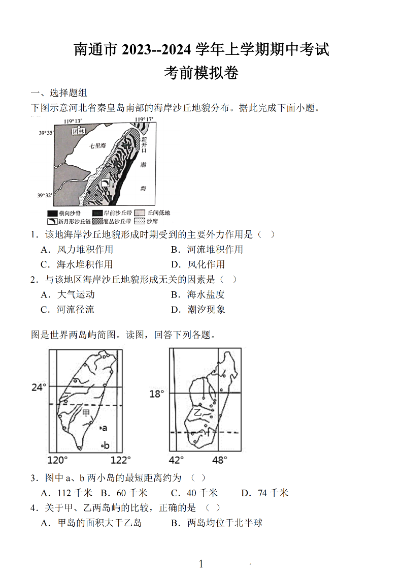 江苏省南通市2024届高三上学期期中考试考前模拟卷 地理