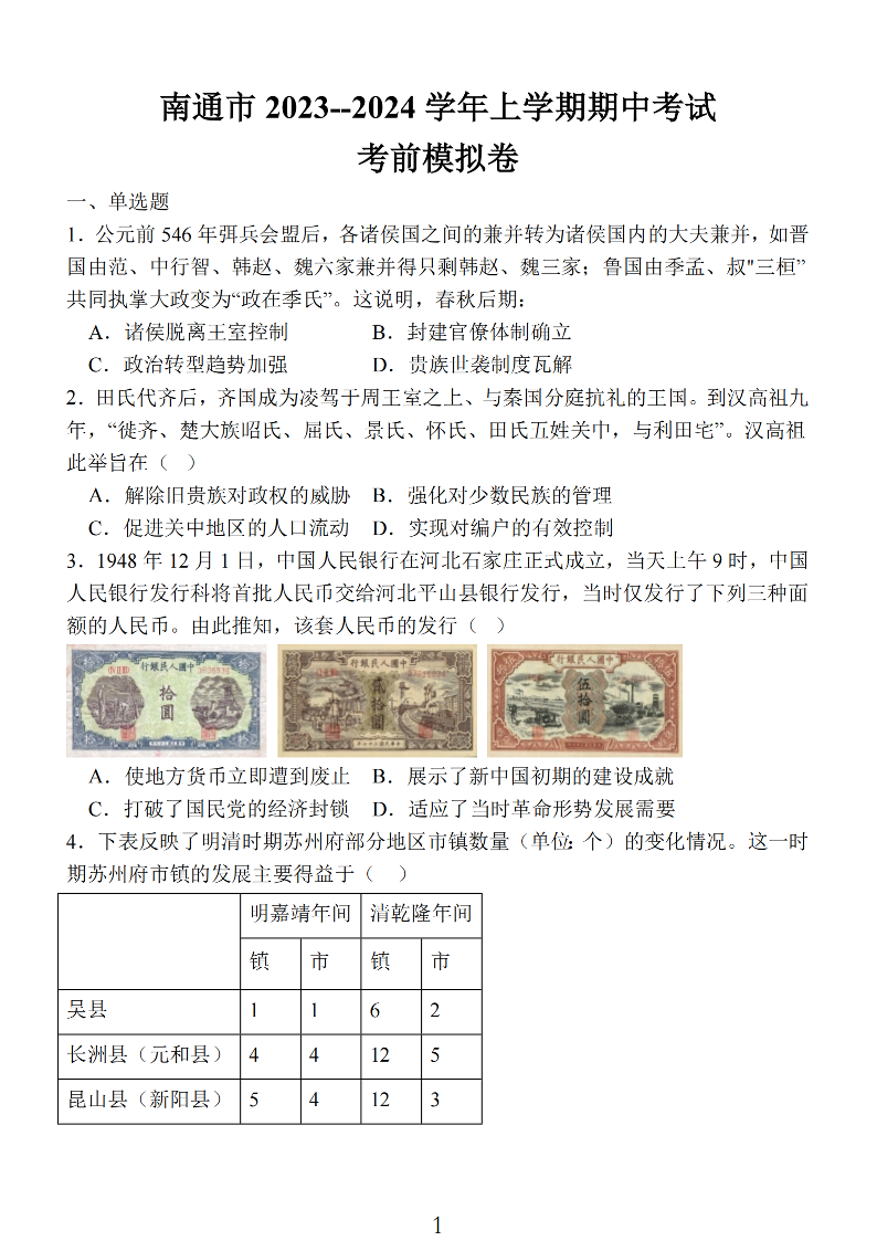 江苏省南通市2024届高三上学期期中考试考前模拟卷 历史
