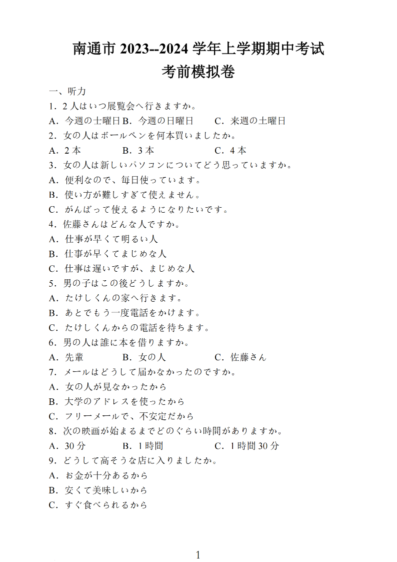 江苏省南通市2024届高三上学期期中考试考前模拟卷 日语