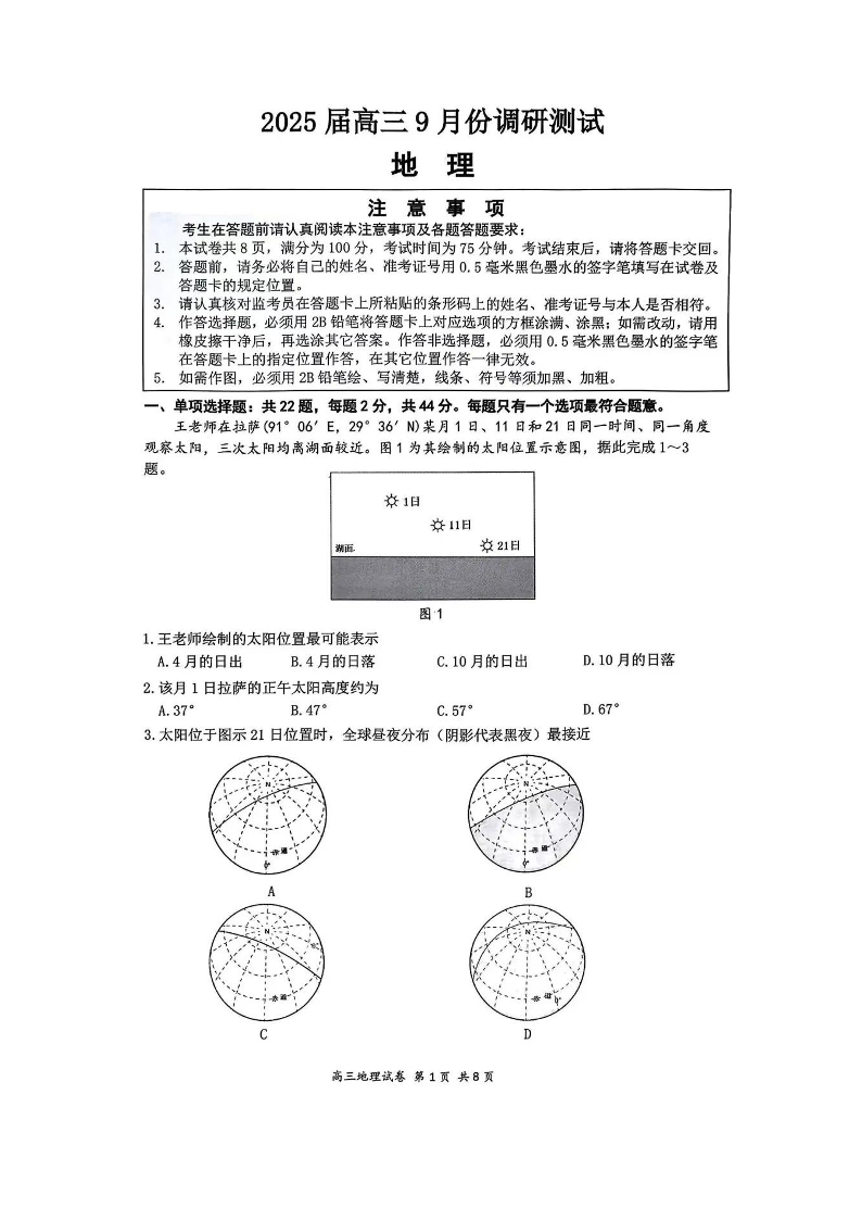 江苏省南通市2025届高三九月份调研测试+地理