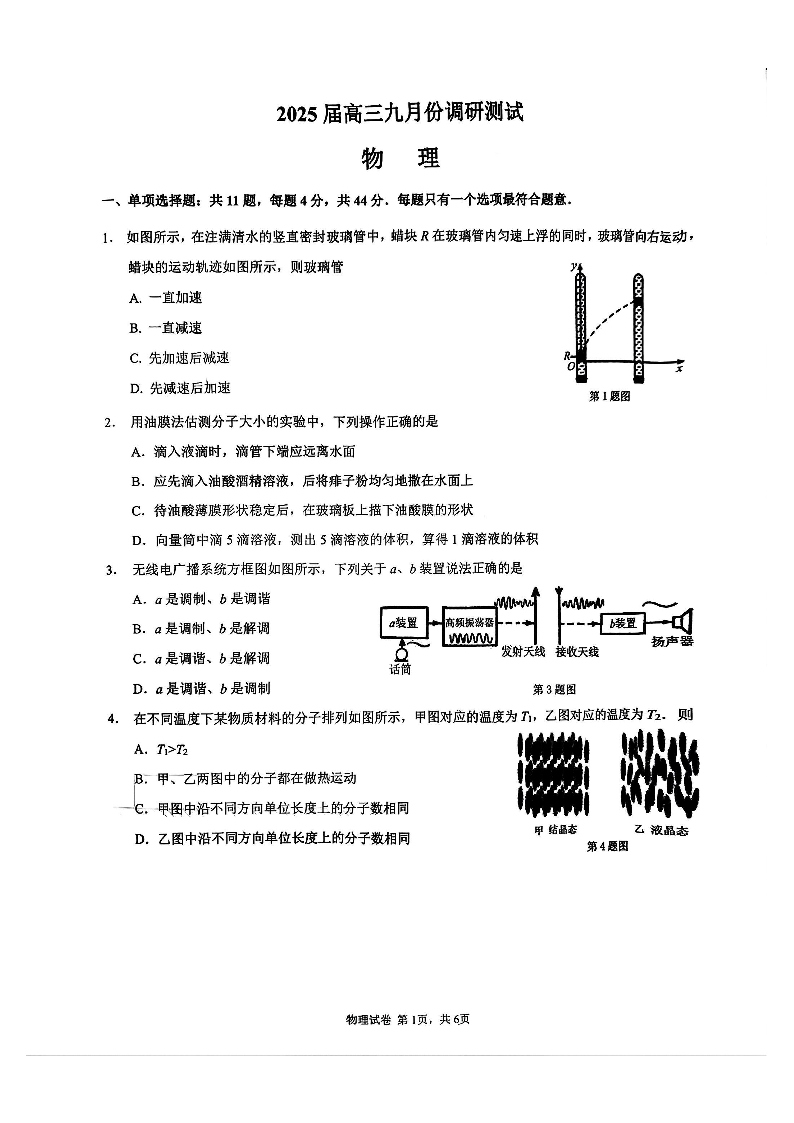 江苏省南通市2025届高三九月份调研测试+物理
