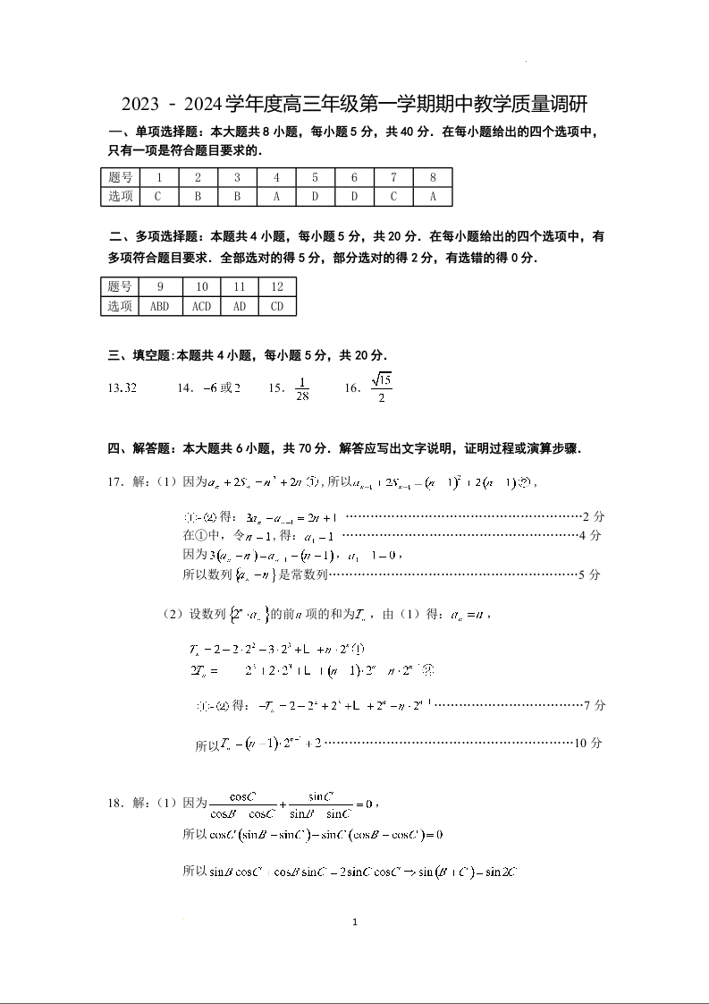 江苏省南通市如皋市2023-2024学年高三上学期调研(二)(期中)数学答案