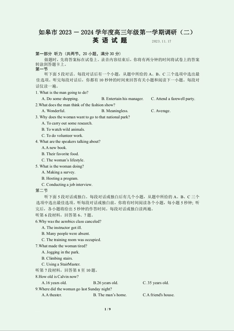 江苏省南通市如皋市2023-2024学年高三上学期调研(二)(期中)英语