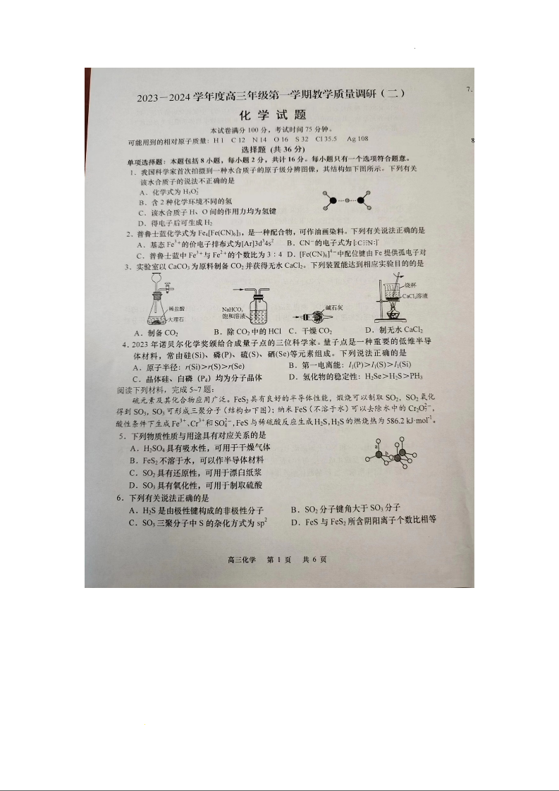 江苏省南通市如皋市2023-2024学年高三上学期调研(二)(期中)化学