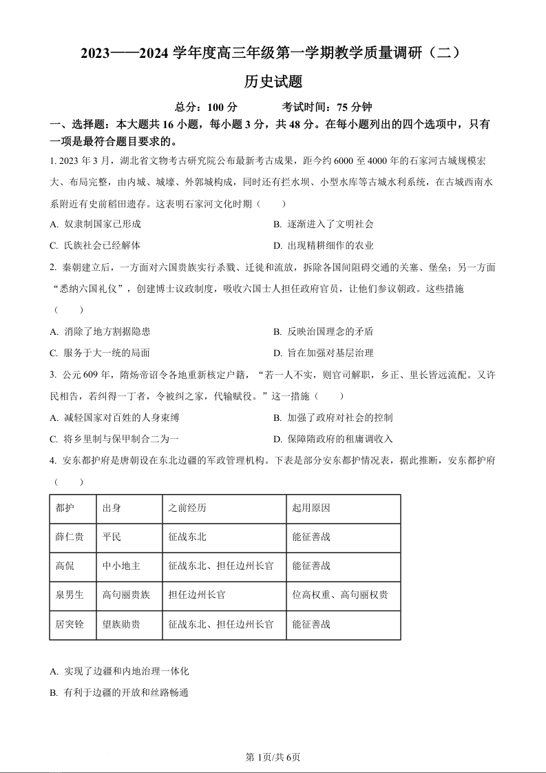 江苏省南通市如皋市2023-2024学年高三上学期调研(二)(期中)历史