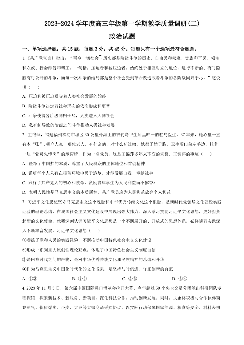 江苏省南通市如皋市2023-2024学年高三上学期调研(二)(期中)政治