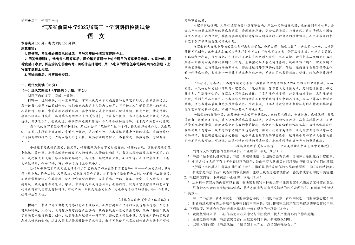 江苏省前黄高级中学2024-2025学年高三上学期期初检测+语文