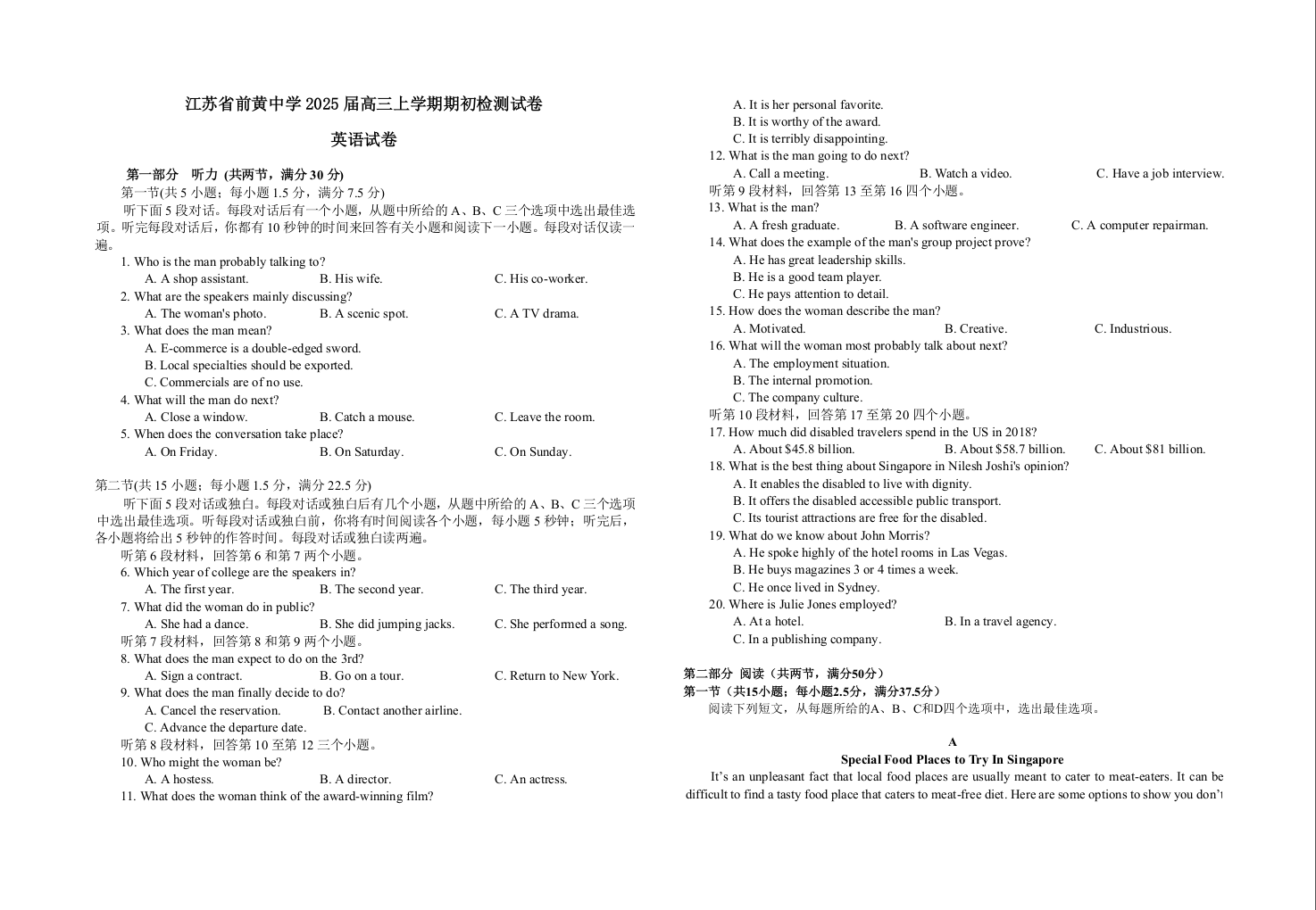 江苏省前黄高级中学2024-2025学年高三上学期期初检测+英语