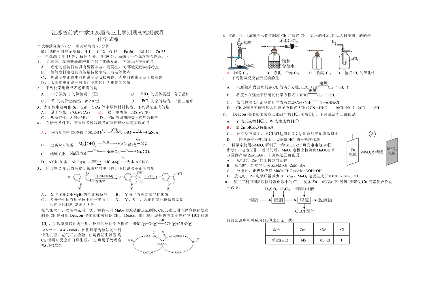 江苏省前黄高级中学2024-2025学年高三上学期期初检测+化学