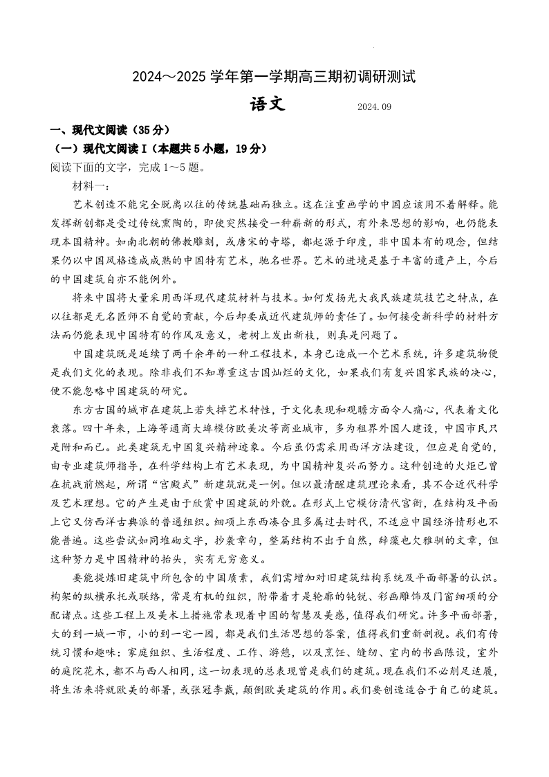 江苏省苏州市2025届高三年级期初阳光调研试卷+语文
