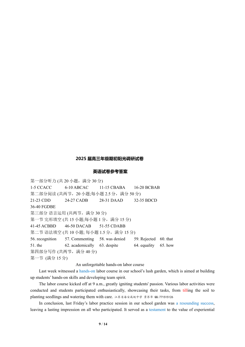 江苏省苏州市2025届高三年级期初阳光调研试卷+英语答案