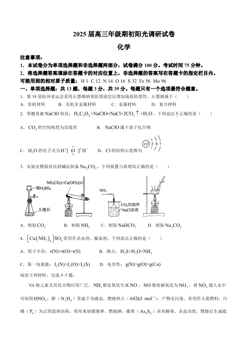 江苏省苏州市2025届高三年级期初阳光调研试卷+化学