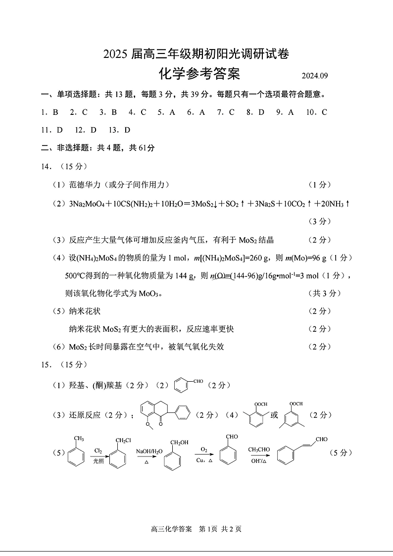江苏省苏州市2025届高三年级期初阳光调研试卷+化学答案