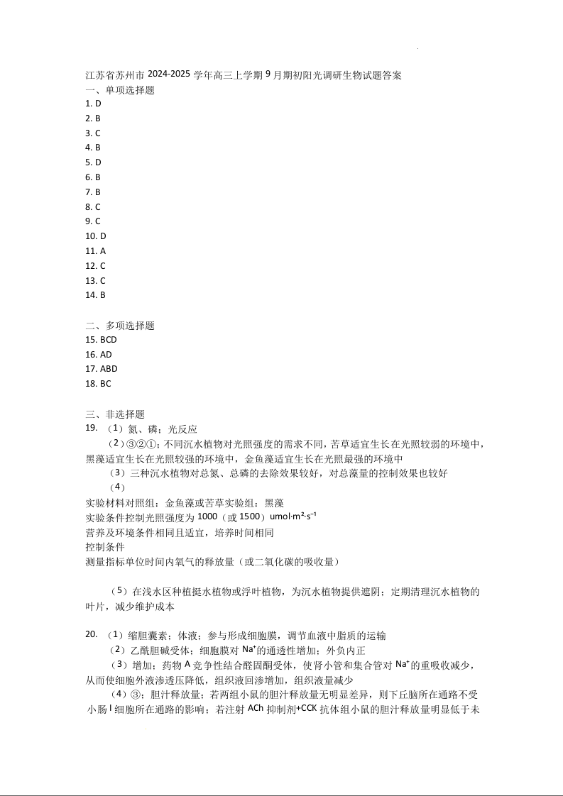 江苏省苏州市2025届高三年级期初阳光调研试卷+生物答案