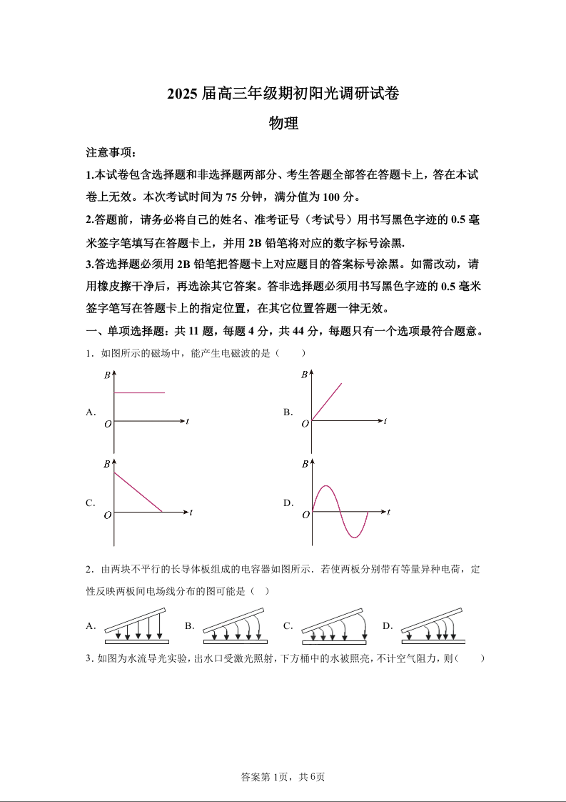 江苏省苏州市2025届高三年级期初阳光调研试卷+物理
