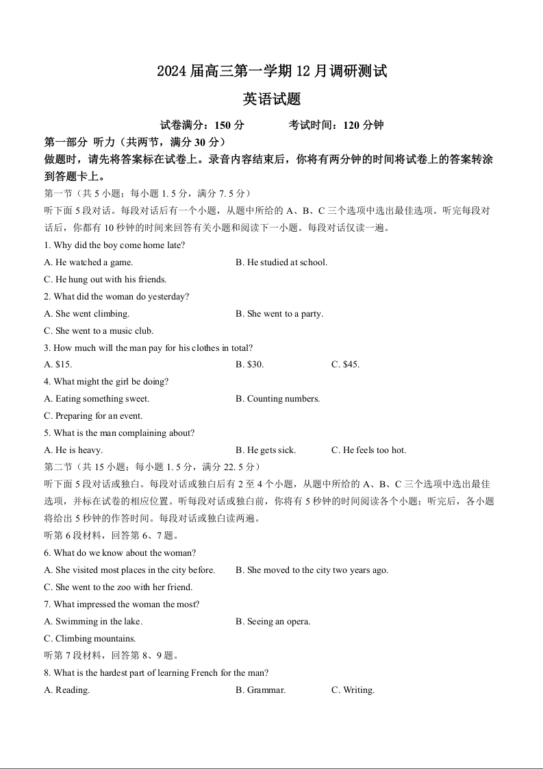江苏省泰州中学、宿迁中学、宜兴中学2023-2024学年高三上学期12月调研测试 英语