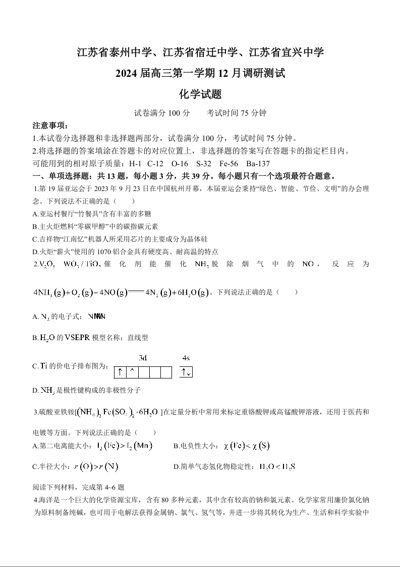 江苏省泰州中学、宿迁中学、宜兴中学2023-2024学年高三上学期12月调研测试 化学